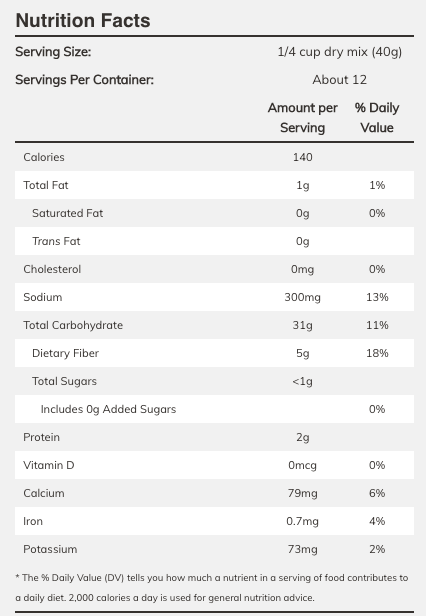 Ingredients: Whole Grain Sorghum Flour, Brown Rice Flour, Potato Starch, Tapioca Flour, Potato Flour, Baking Powder (baking soda, monocalcium phosphate, non-gmo corn starch), Baking Soda and Xanthan Gum.