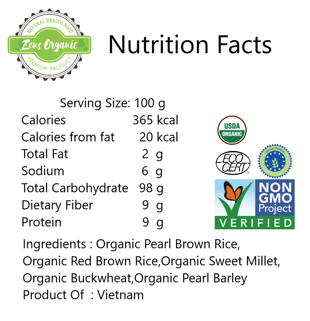 Ingredients: Organic Pearl Brown Rice, Organic Red brown rice, Organic Sweet Millet, Organic Buckwheat, Organic Pearl Barley