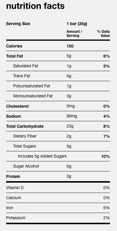 Ingredients: Oats, tapioca syrup, canola oil, brown rice, semi-sweet chocolate (sugar, chocolate liquor, cocoa butter, soy lecithin, vanilla extract), millet, cane sugar, honey, brown rice flour, buckwheat, amaranth, oat flour, unsweetened chocolate, coconut, sea salt, molasses, cocoa powder, quinoa, brown rice syrup, natural flavor, Vitamin E (tocopherols to maintain freshness).