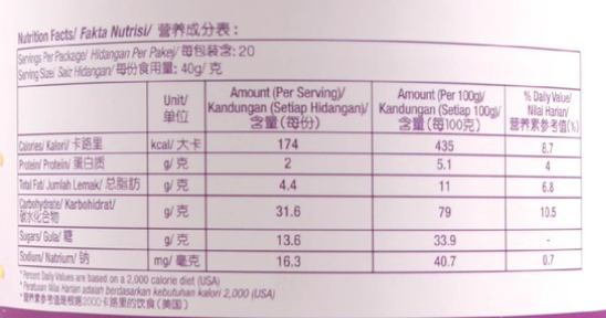 Ingredients: Brown Rice, Barley, Millet*, Oat, Wheat, Black Rice, Red Rice, Black Glutinous Rice, Sesame, Quinoa, Soya Powder*, Purple Sweet Potato Powder, Isomalto-Oligosaccharide, Coconut Oil Powder, Malt Powder, Natural Vanilla Extract, Almond Powder, Inulin, Lecithin, Seaweed Calcium* and Probiotics (*Organic)